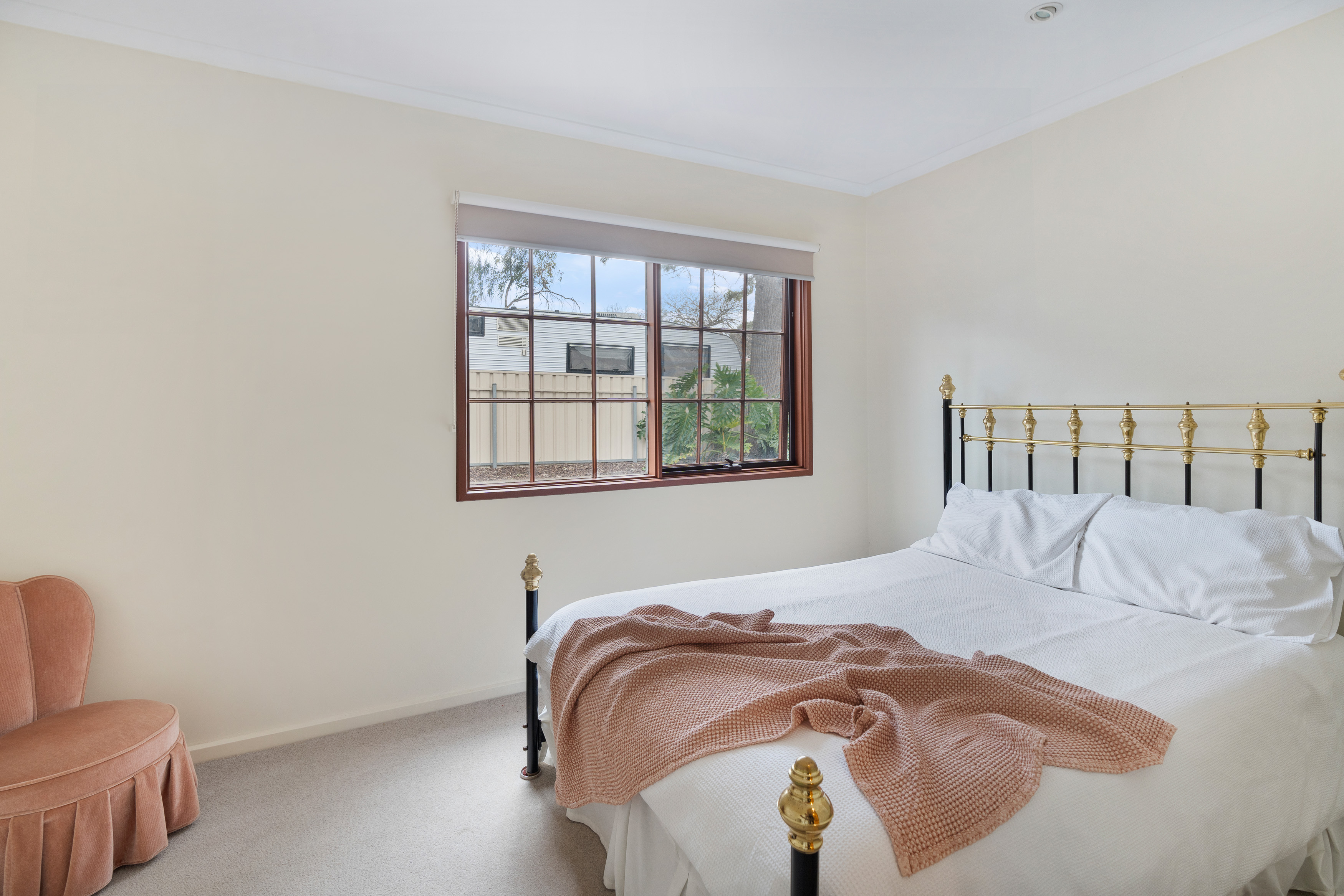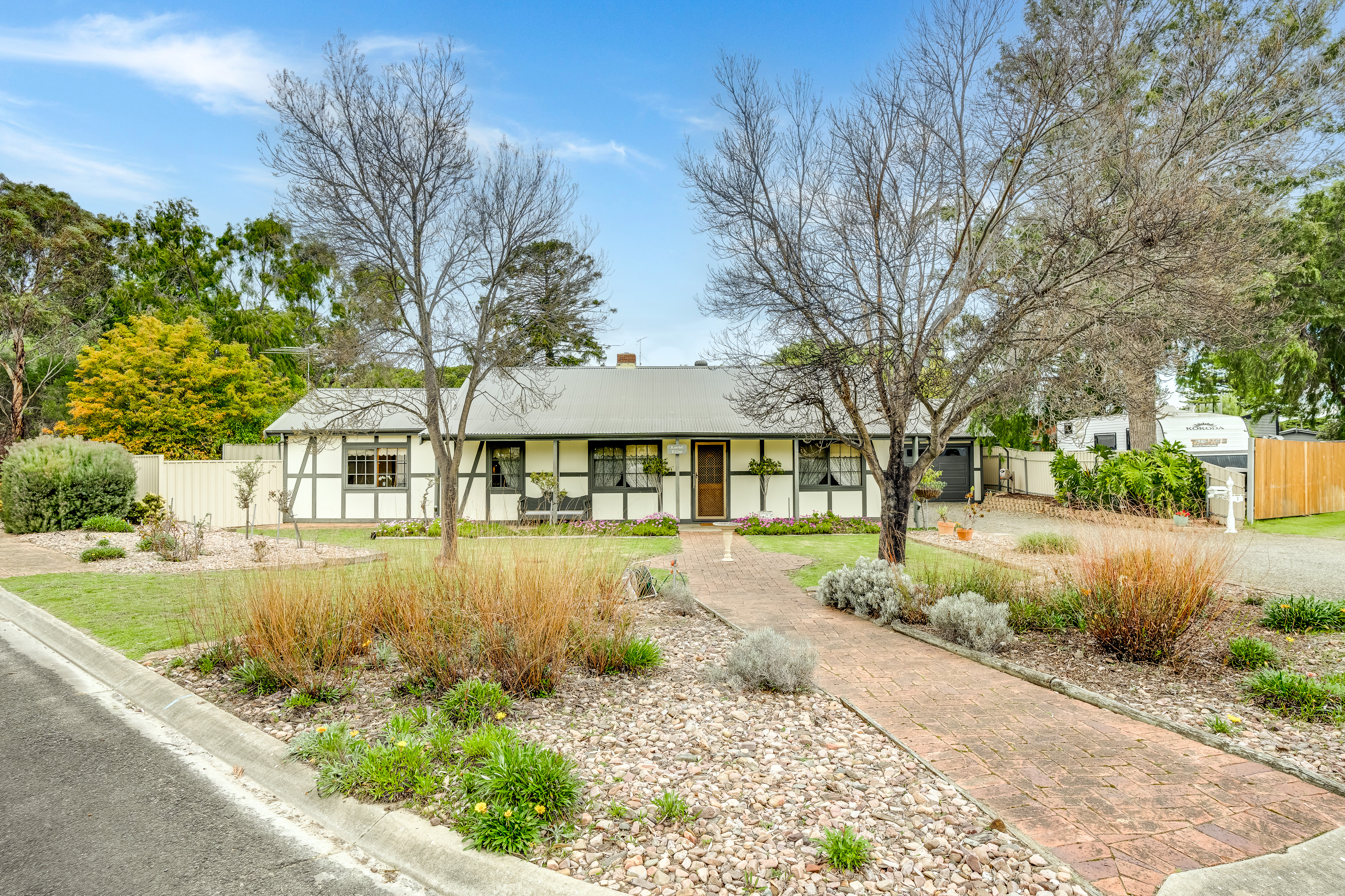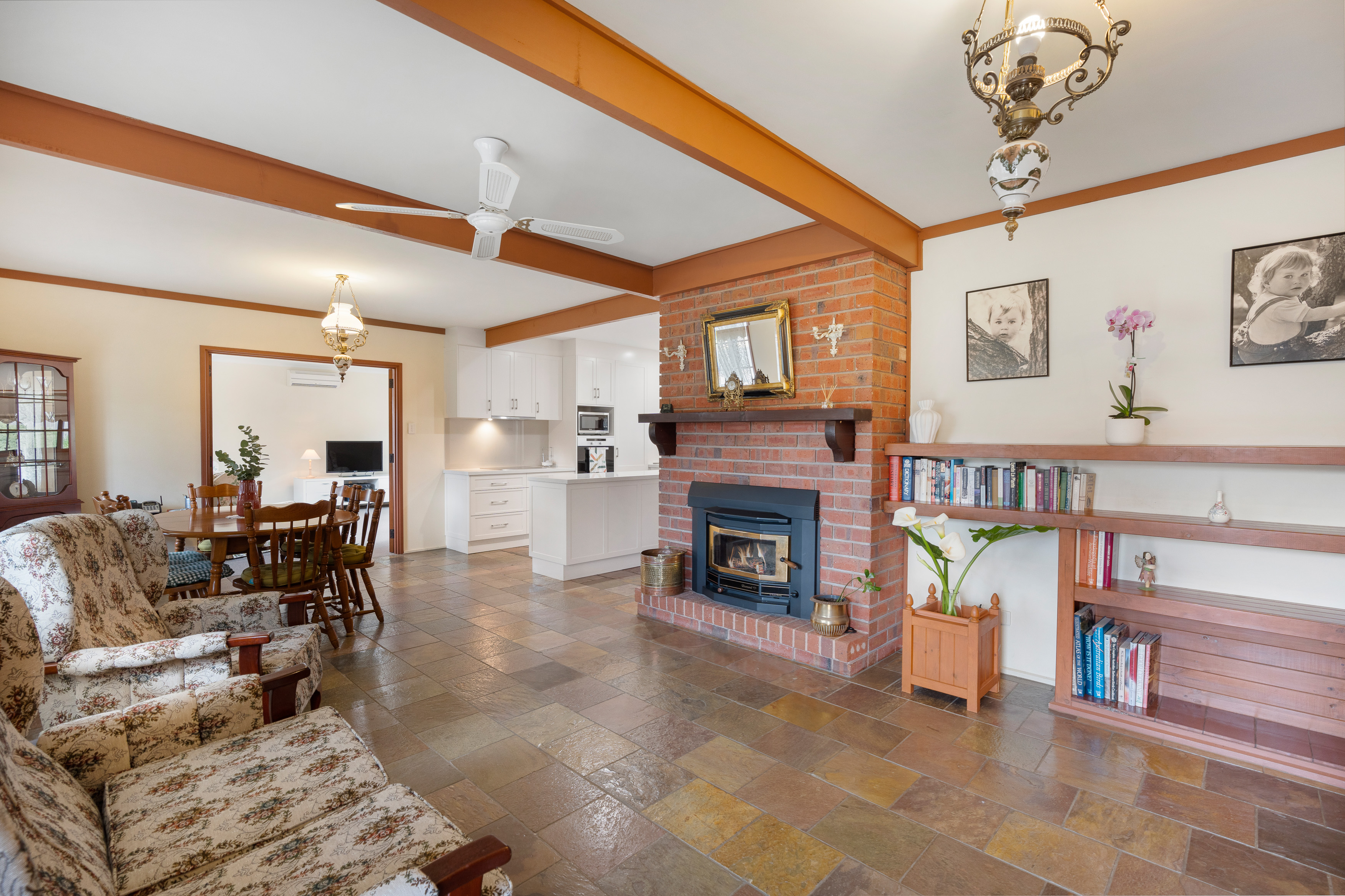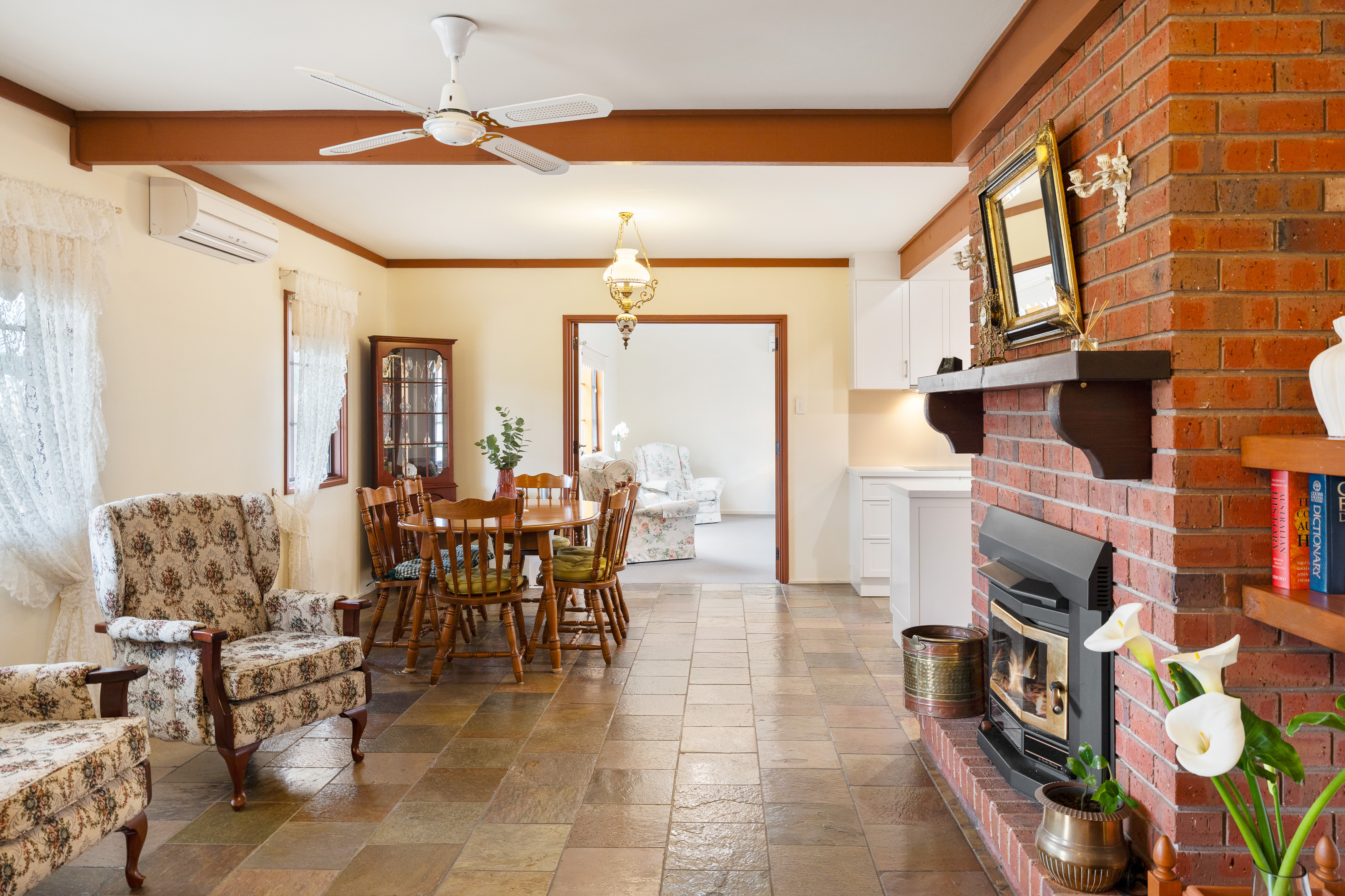 Immaculately presented both inside and out. Cottage gardens greet you, while a front verandah invites you to soak up the north-facing sunshine. Step into the spacious open-plan living, dining and kitchen area - featuring slate floors, exposed timber beams and a brick mantle with combustion fire. Enjoy year-round comfort with split-system air conditioning and ceiling fans. Built-in shelving and storage cupboards add practicality, while timber windows frame lovely views of the front yard.