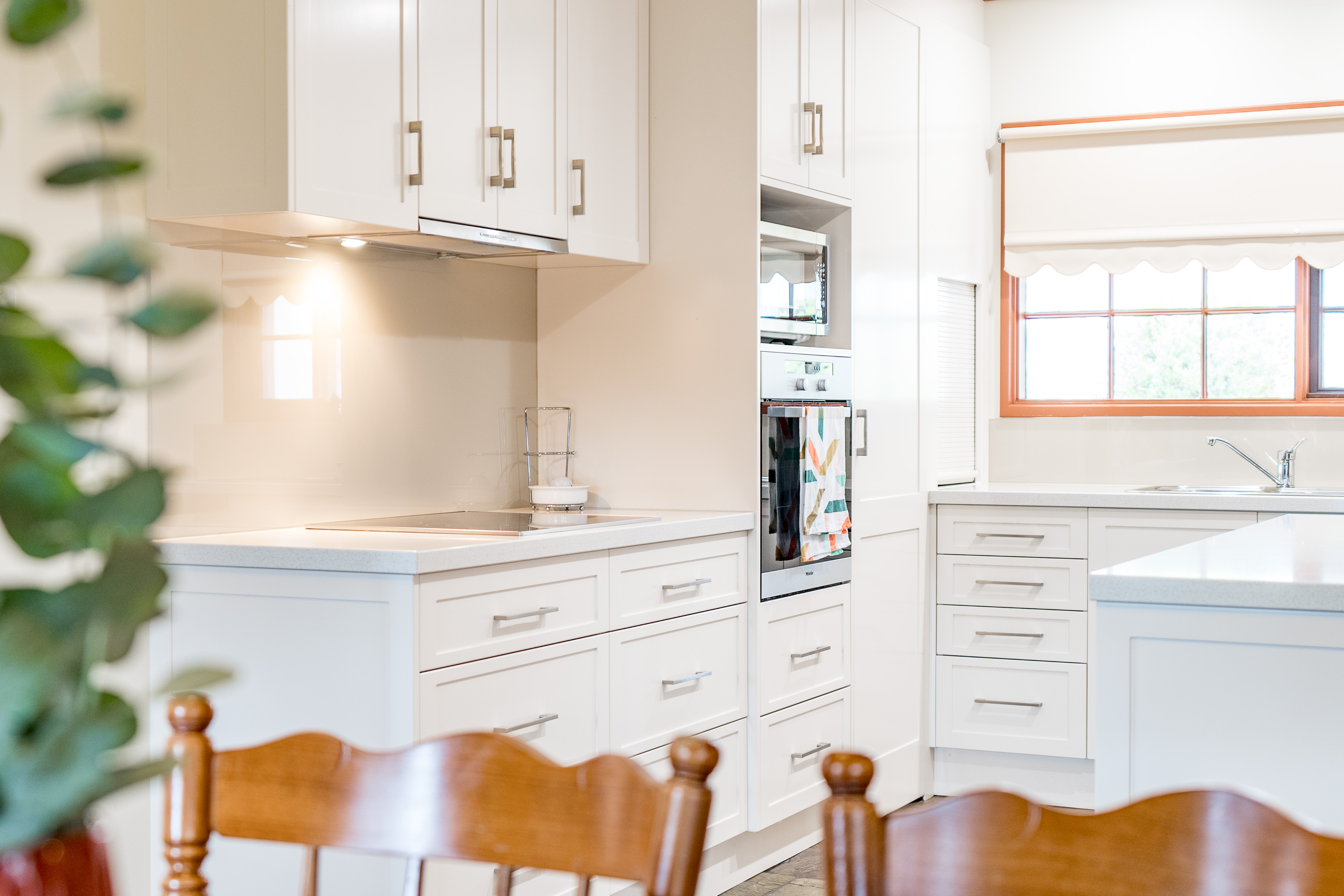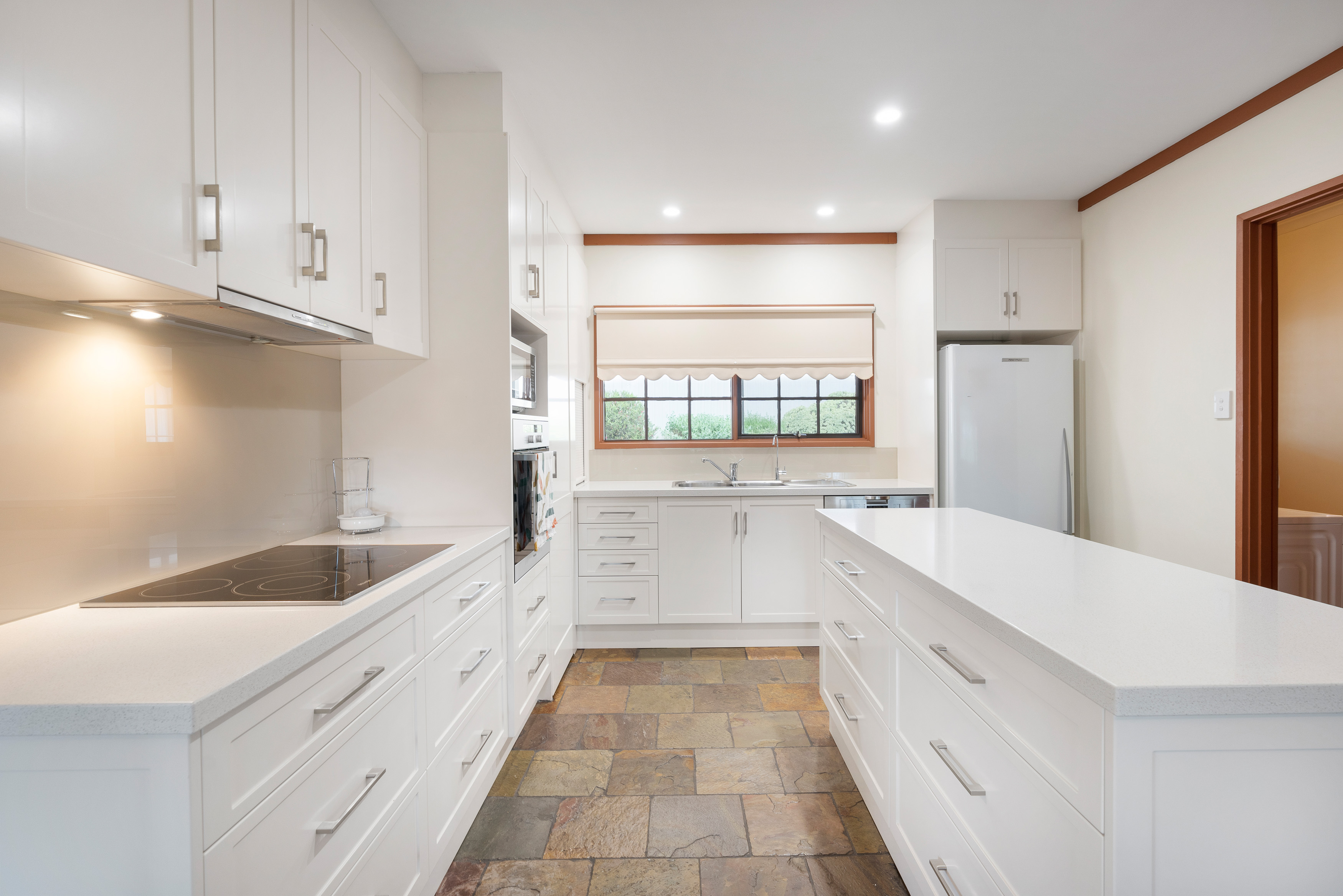 The modern white kitchen is perfect for entertaining. Caesarstone benchtops and a large breakfast bar complement quality Miele appliances including dishwasher, wall oven and cooktop. A Puratap provides filtered water, while abundant storage includes large pull-out drawers, pantry and overhead cupboards.