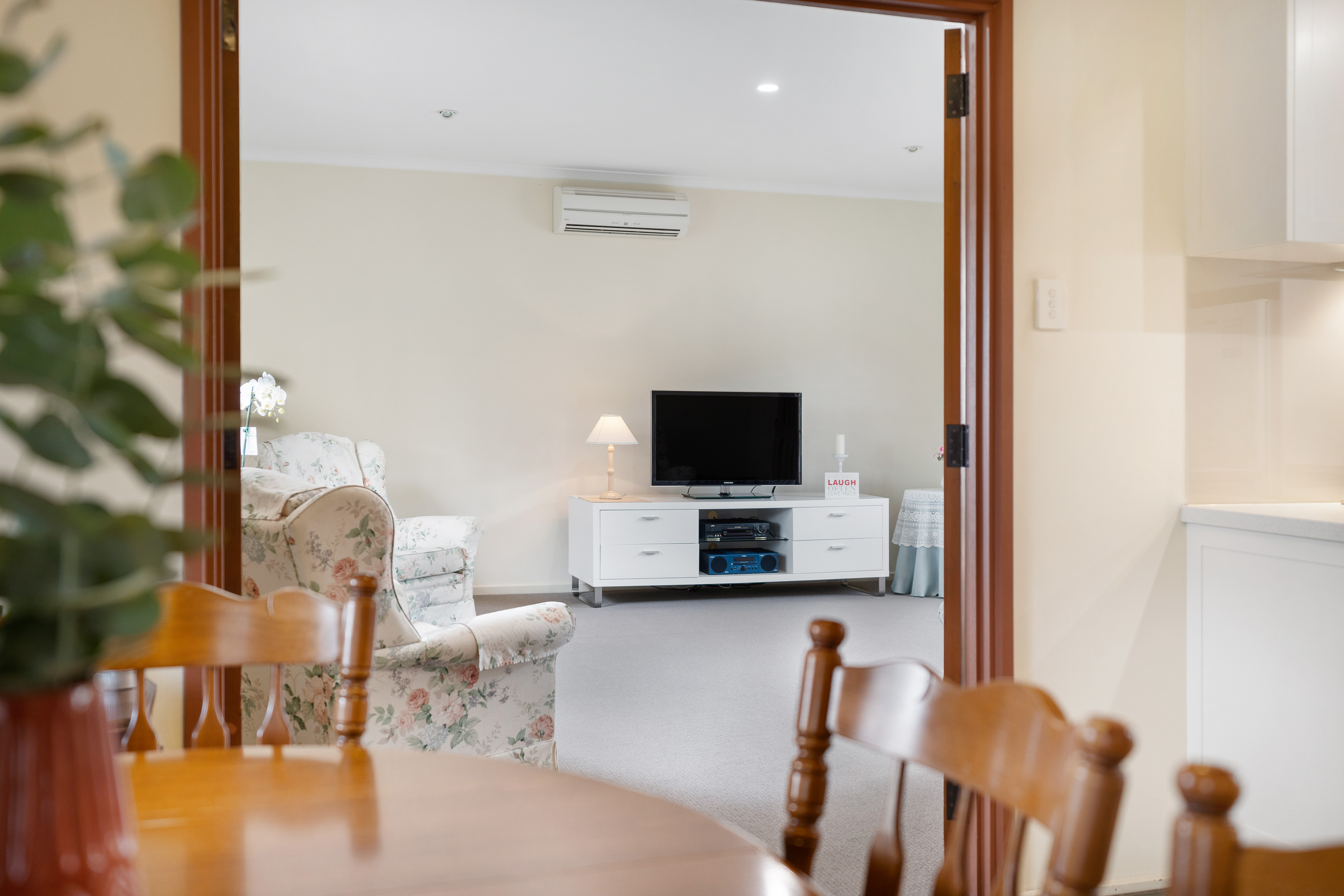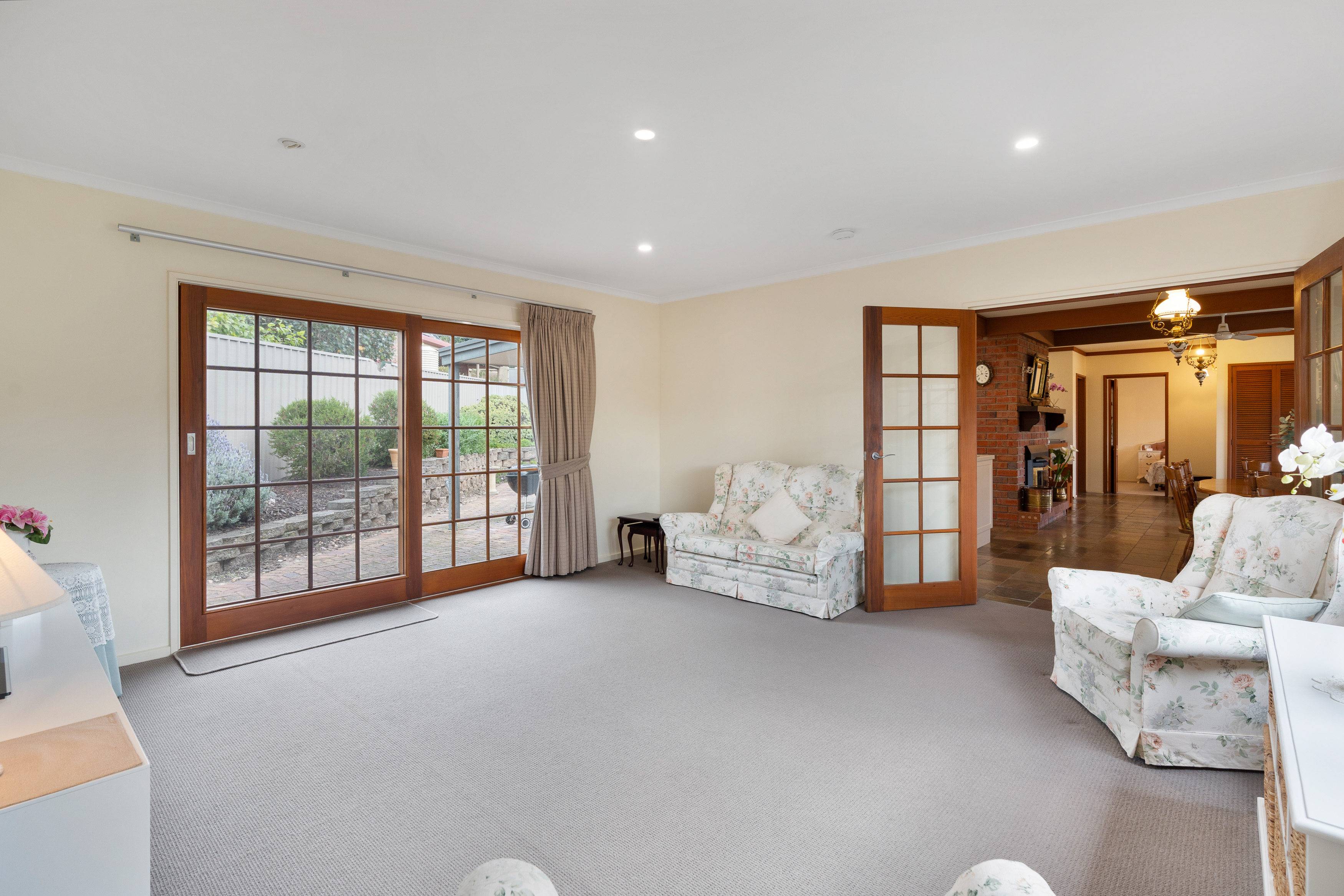 Double French doors lead to a generous second living room. This light-filled space boasts split system air conditioning, plush carpeted flooring and large timber sliding doors that open onto a paved outdoor entertaining area.