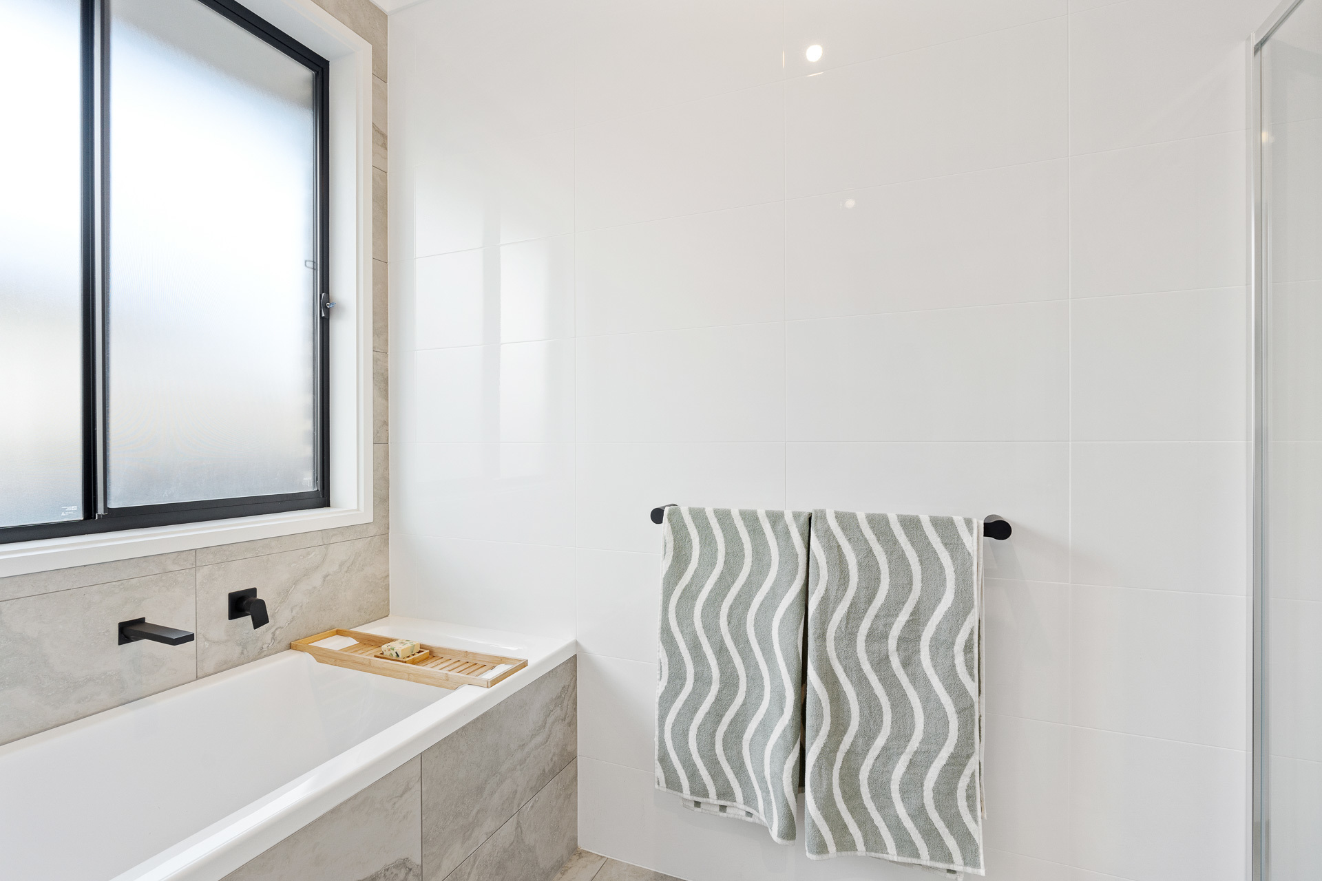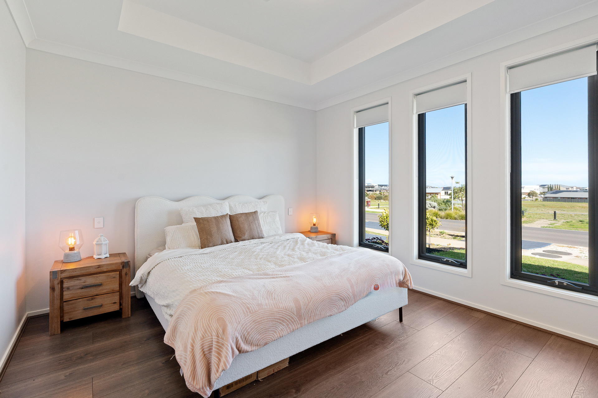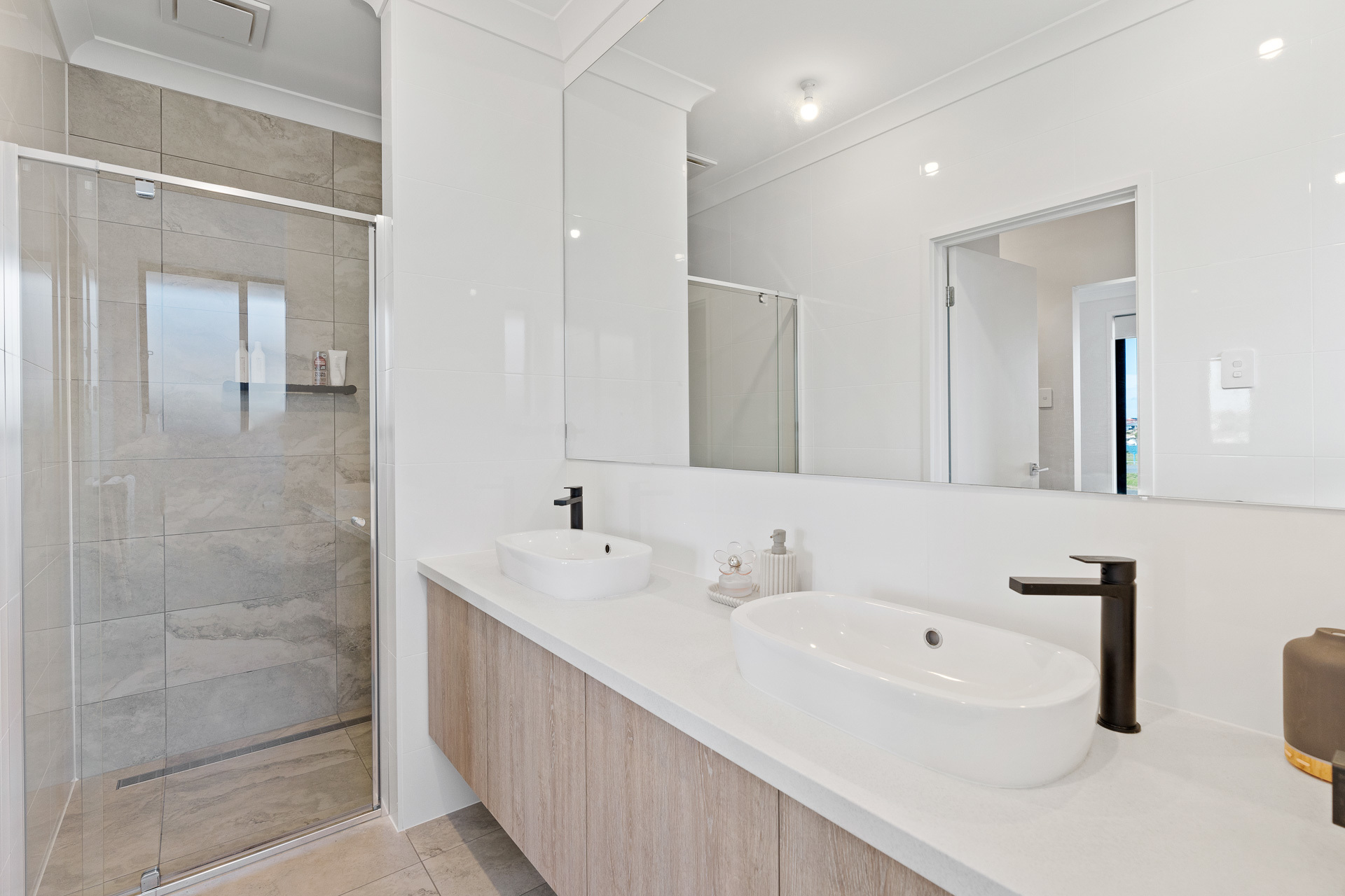 To the fore, the master bedroom drifts away to subtle water glimpses, walk-in robes, and the latte tones of a sparkling ensuite with dual basins and an extra-deep shower stall.