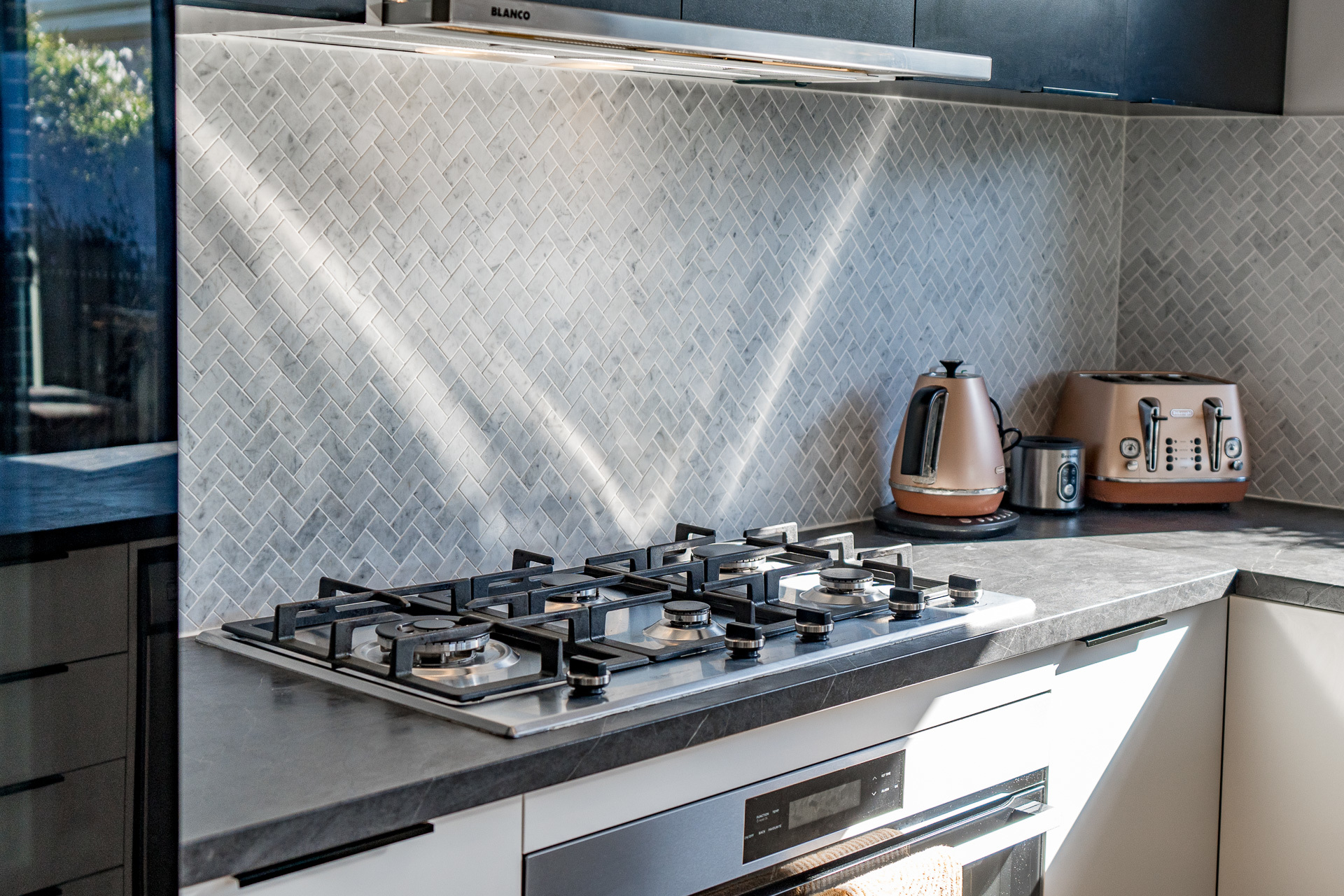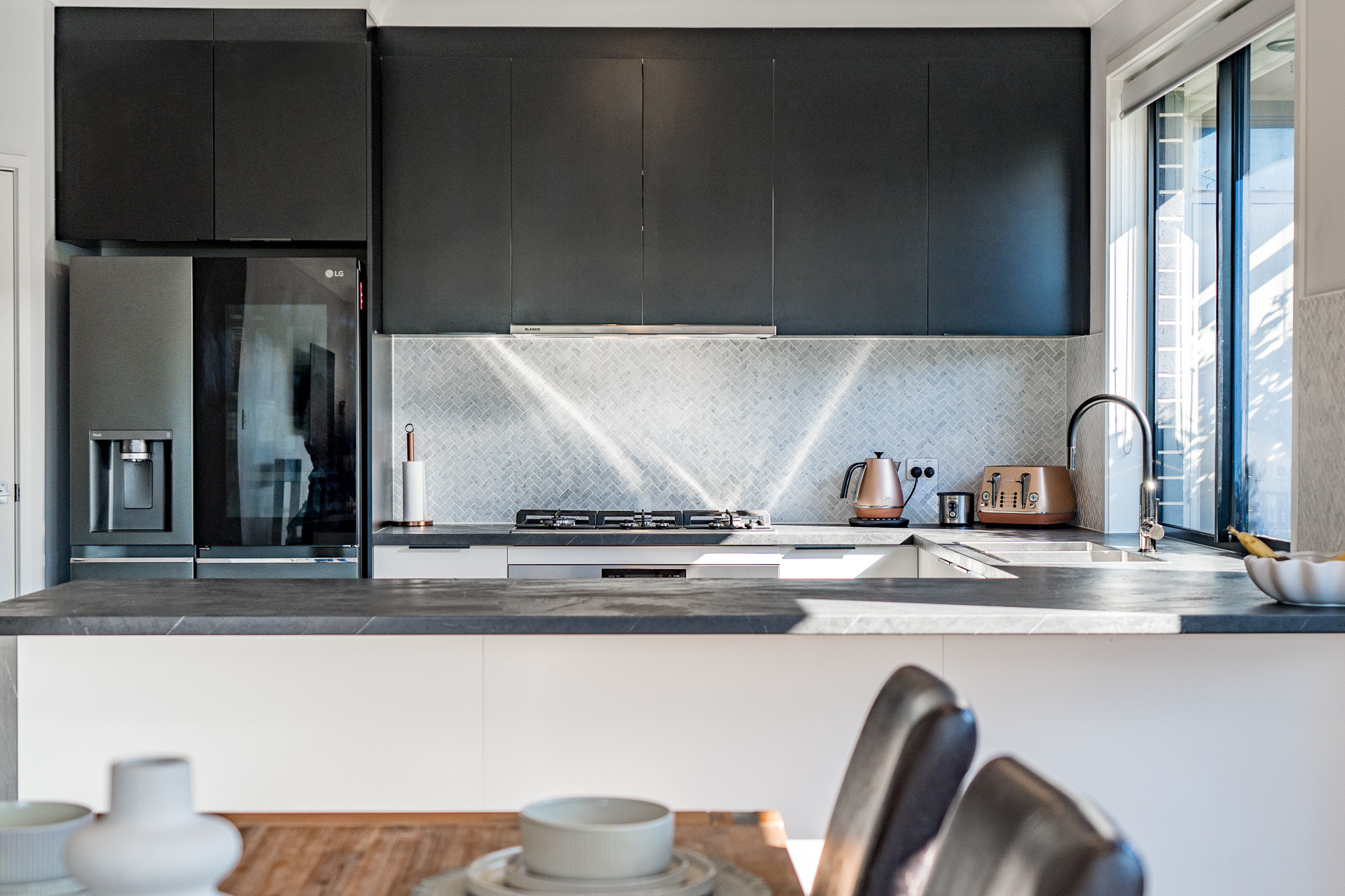 A striking kitchen, well placed for sunlight, backyard reach and dinner conversations, issues dual door fridge capacity, herringbone splash backs, a stainless 5-burner gas stove, and a walk-in pantry.
