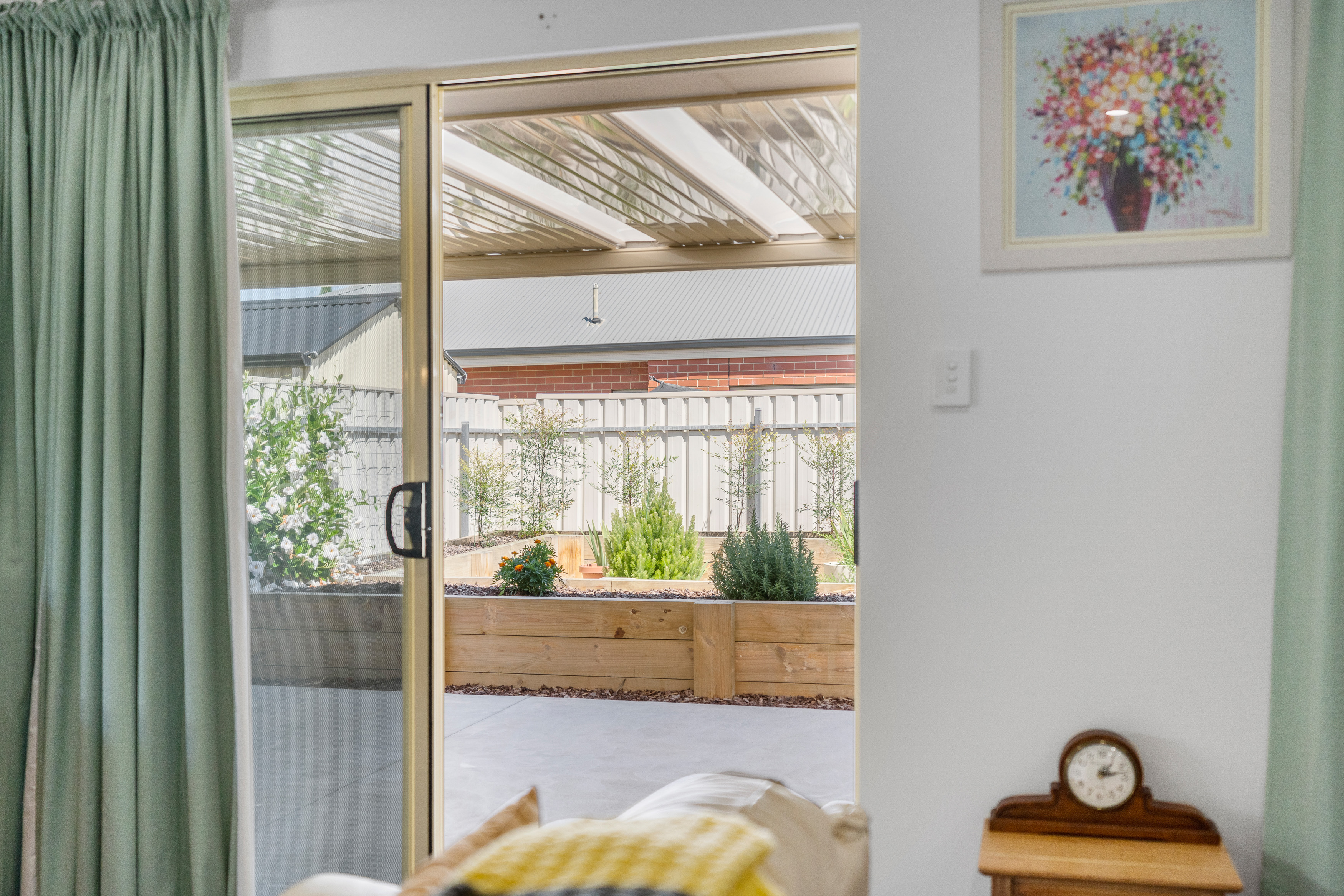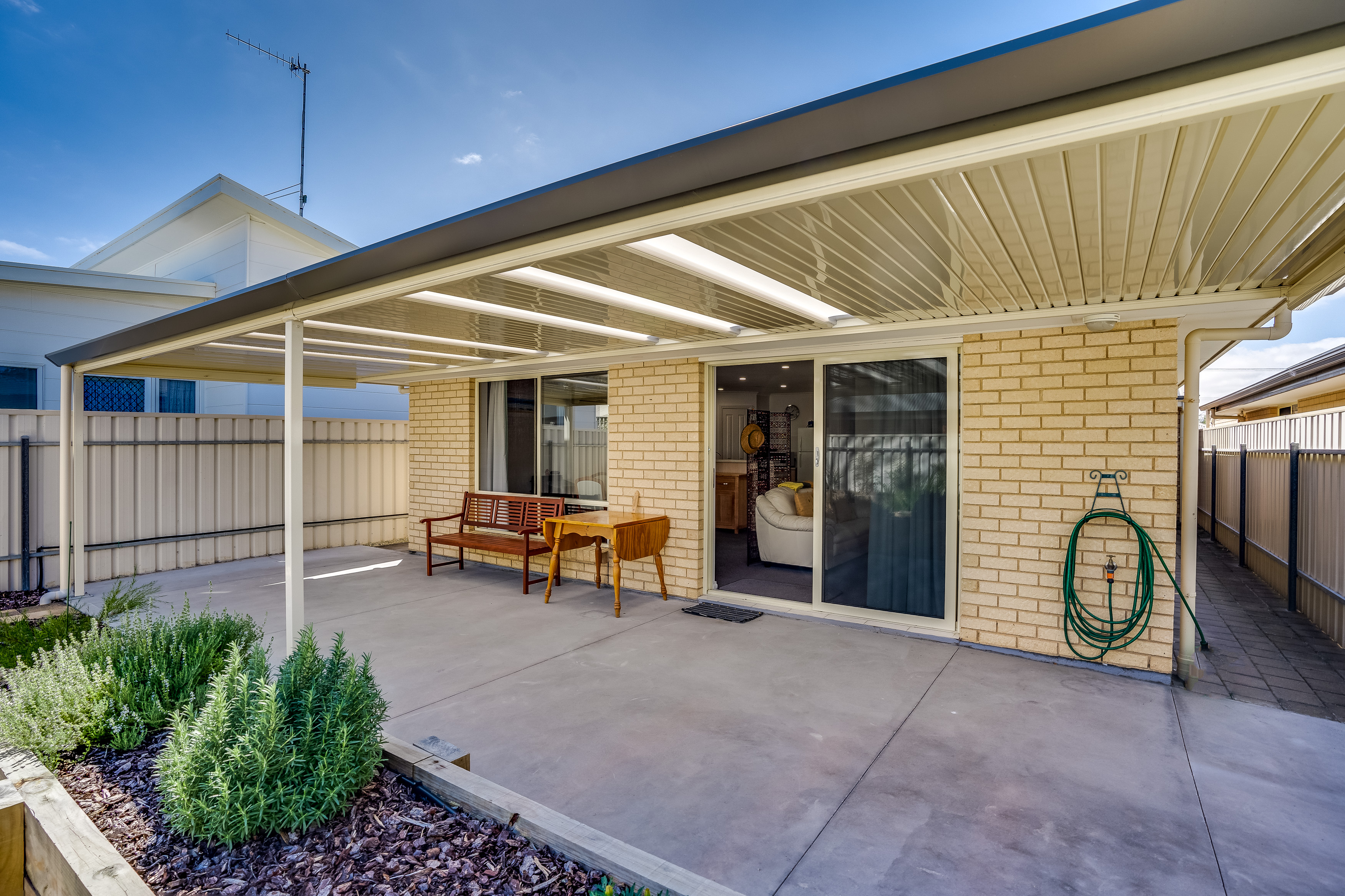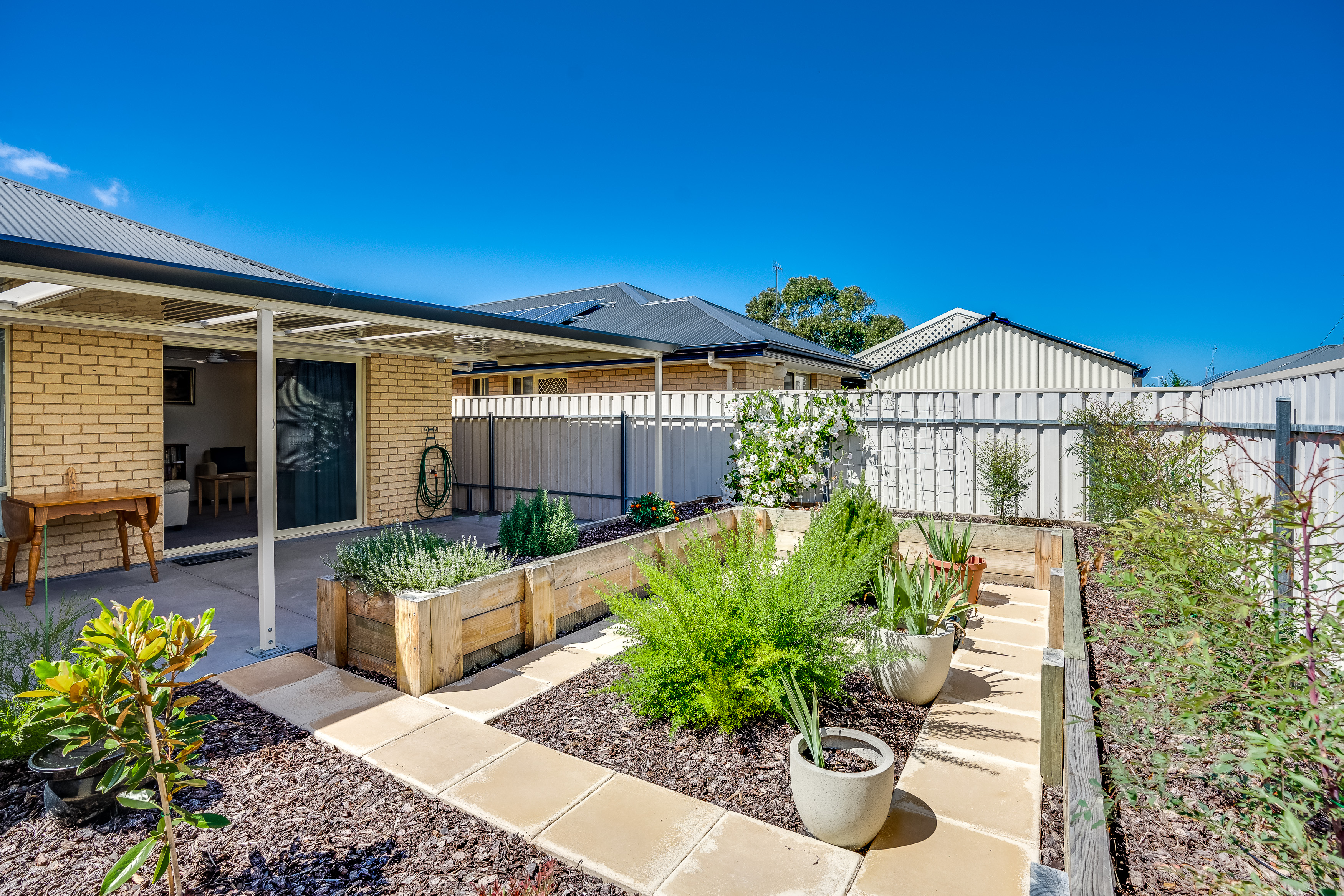 This generous space opens up through the sliding doors to the outside undercover pergola and back yard with shrubs and gardens, on drippers. A great spot to enjoy a bbq with friend and family. Private, secure and fully fenced plus a convenient tool shed to keep the gardening tools.