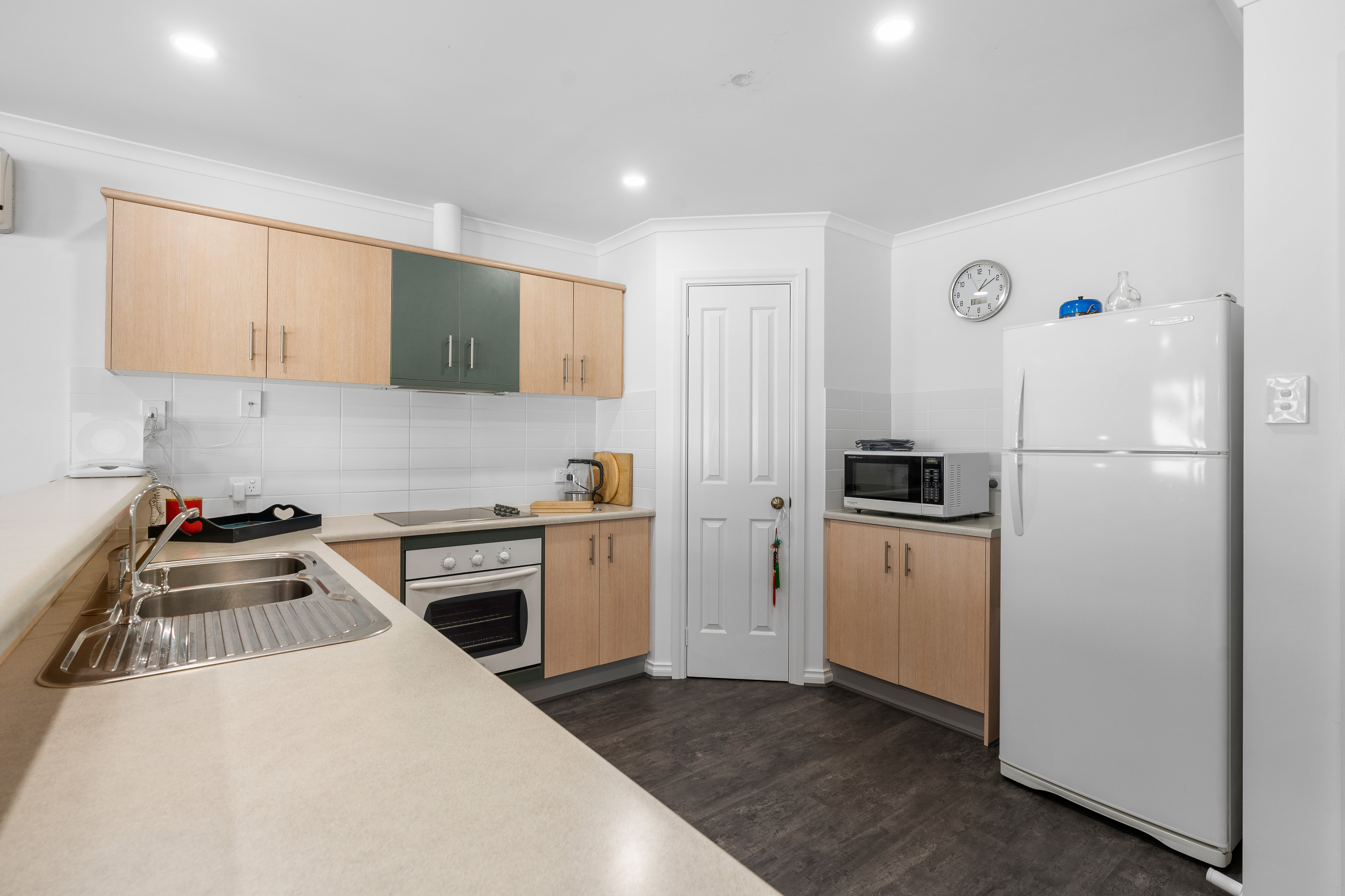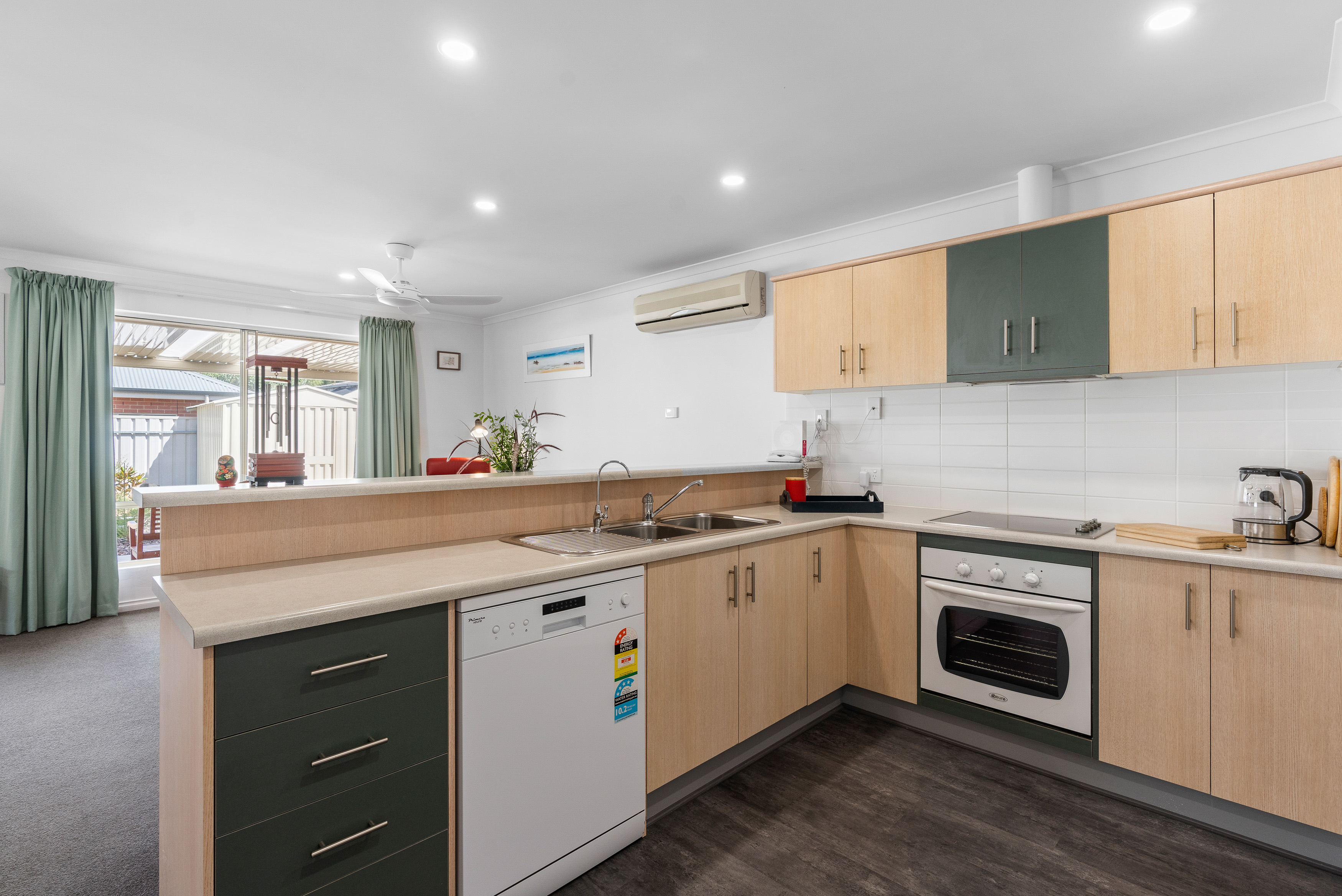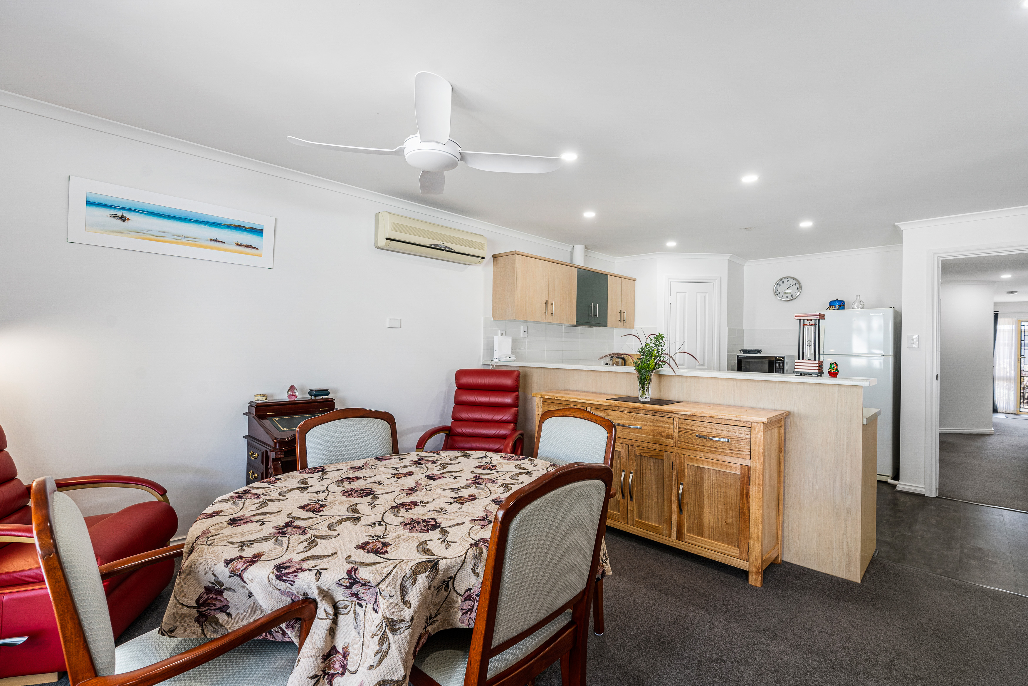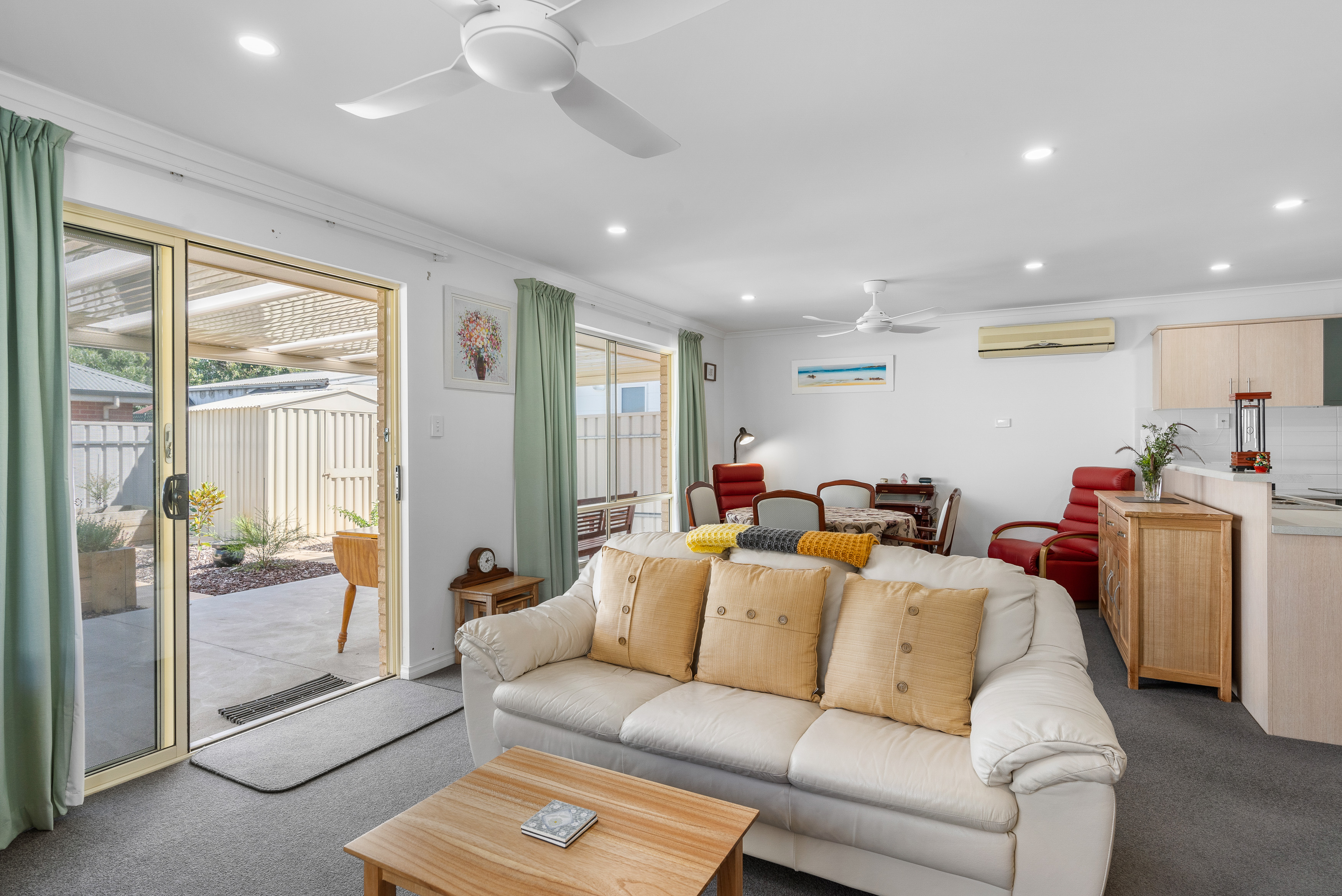 Kitchen, dining and living, with as new flooring & lights, SSRC Air Conditioning and Ceiling Fans.
