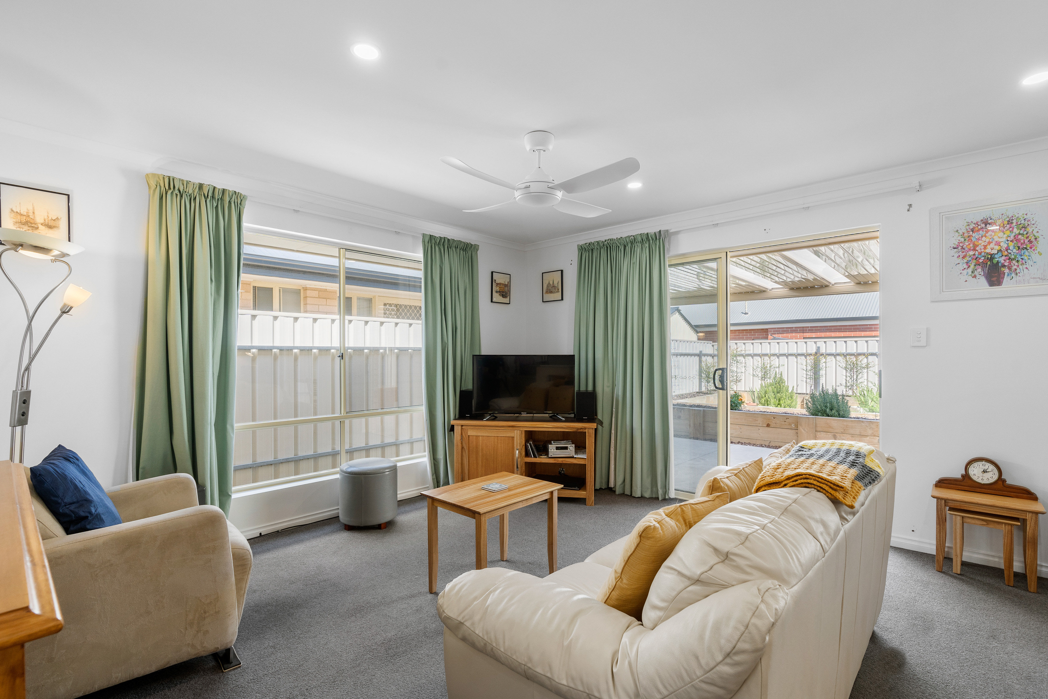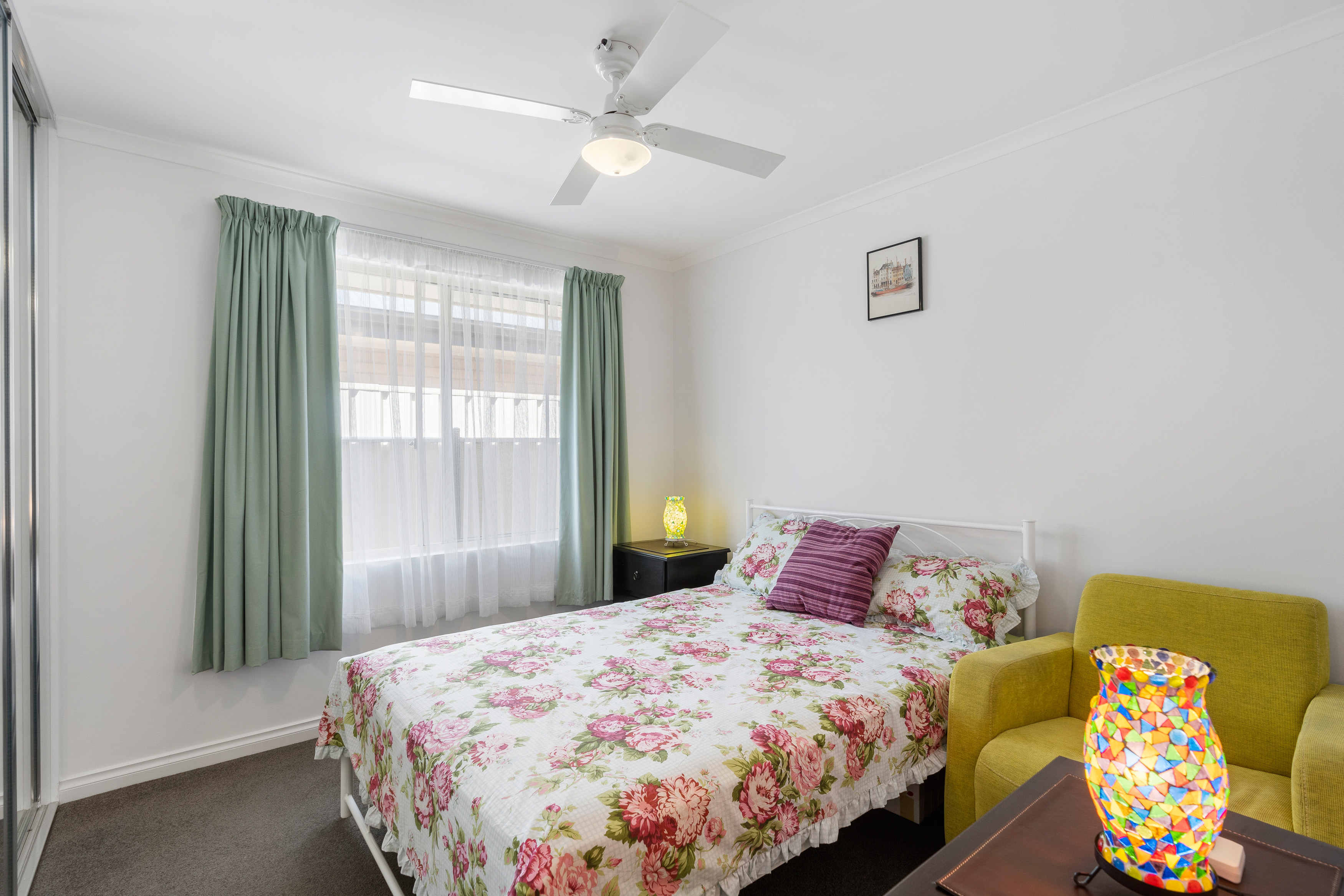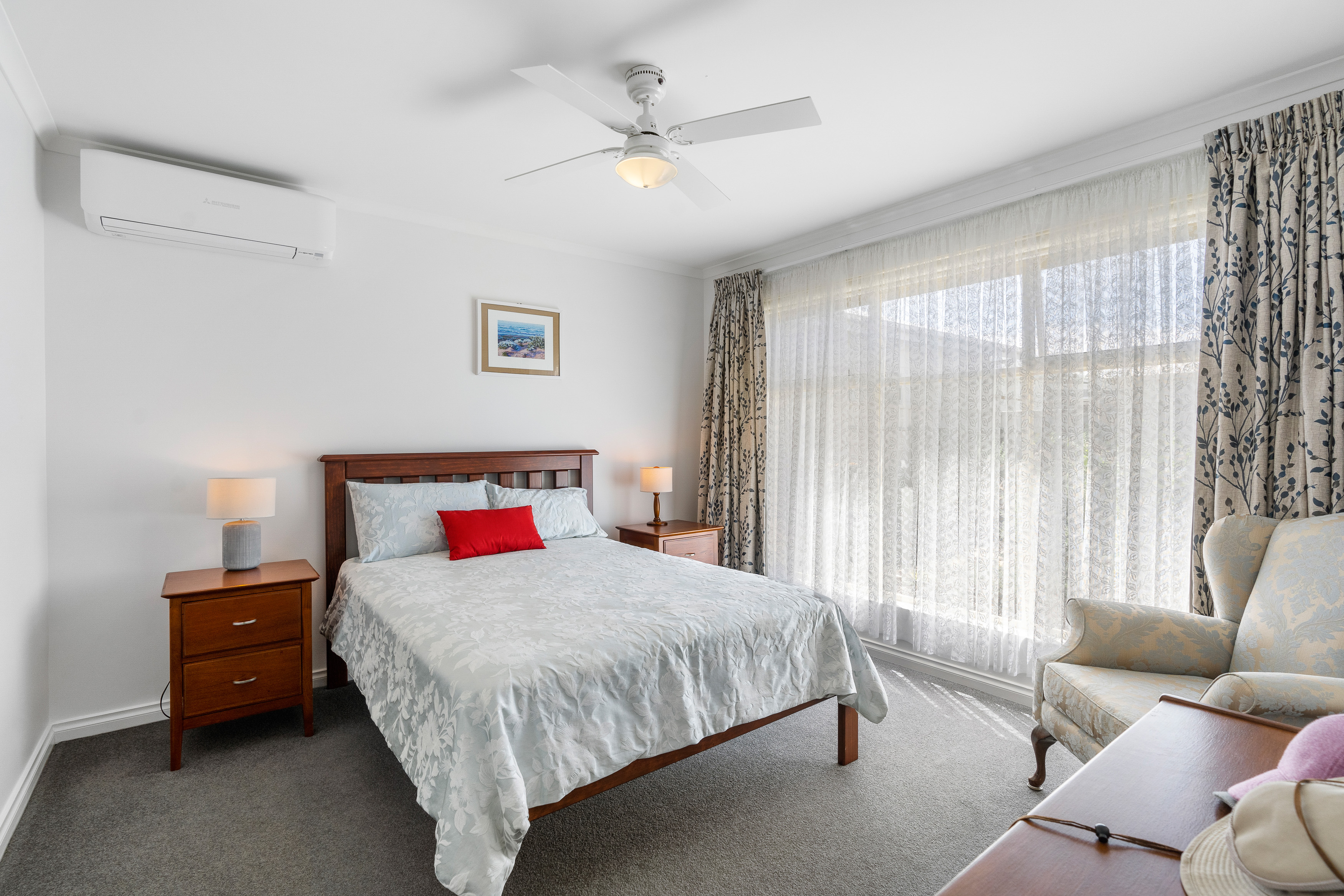 3 bedrooms. Master with WIR, ceiling fan and access to the 2 way bathroom with a separate toilet and vanity area. The other 2 bedrooms both have built in robes, carpet and ceiling fans.