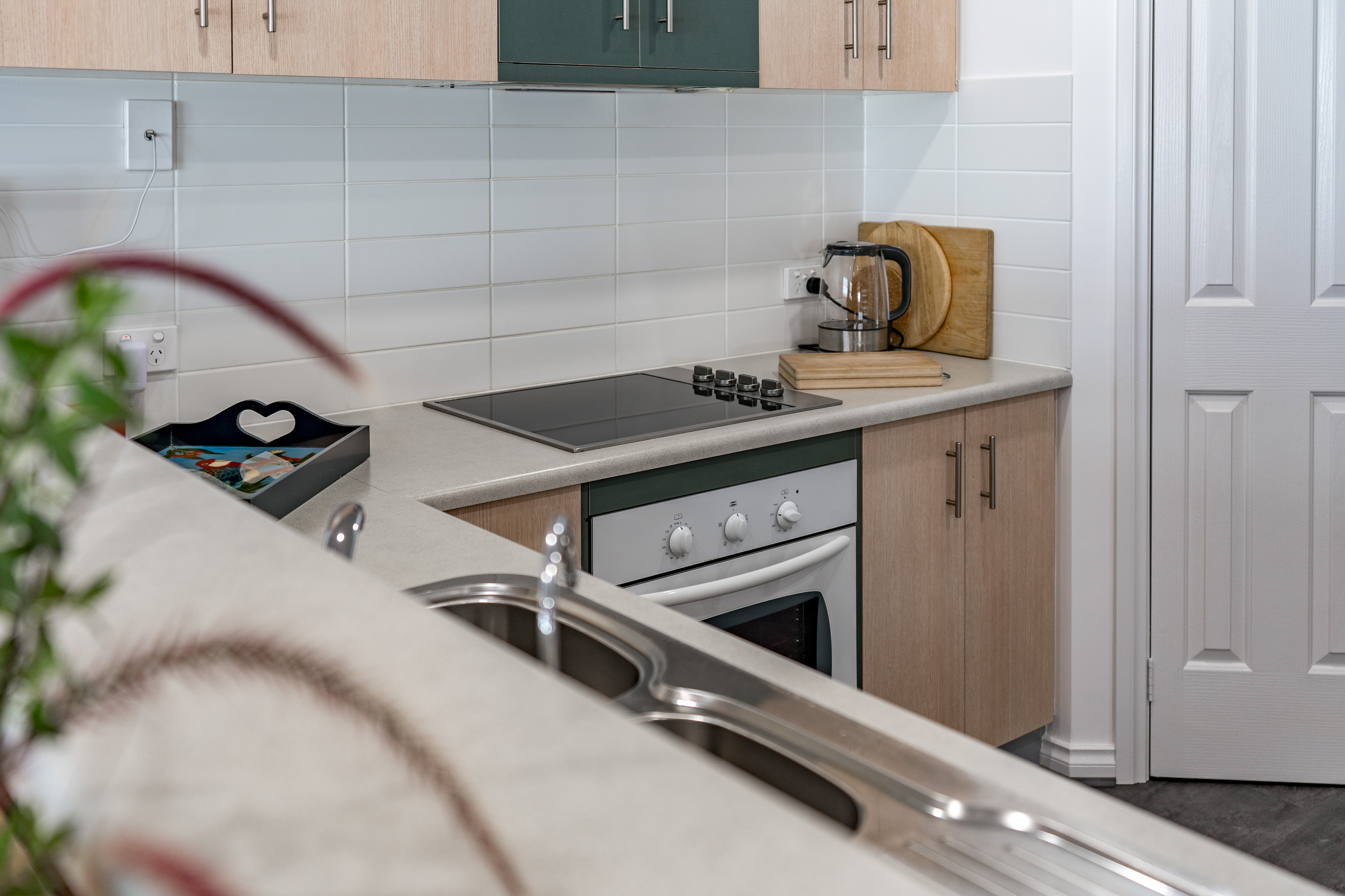 Modern kitchen with dishwasher, pantry, electric oven and raised breakfast bar.